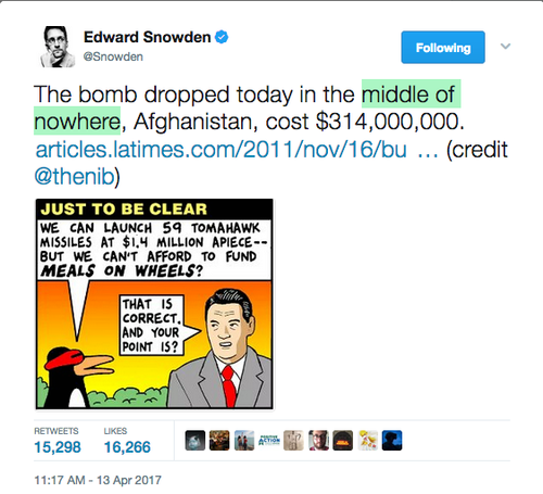 Edward Snowden, the former CIA operative turned whistle blower and President of Freedom of the Press Foundation, a US based non profit organization dedicated to defending “adversarial journalism” and whistle blowers, commented on the economics of the bombing – emphasizing the cost of the MOAB as “$314,000,000″ and that it was dropped “in the middle of nowhere“.