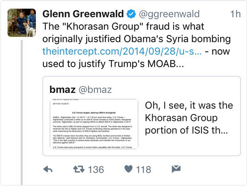 Greenwald and Snowden, made erroneous and sloppy comments – the Islamic State of Khorasan group has little to nothing to do with the supposed “Khorasan Group” of Syria, it has an entirely different history/inception and Greenwald clearly mixed them up (and took down the tweet without comment).